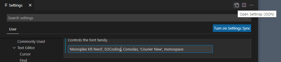 설정 (Ctrl + ,)에서 오른쪽 상단의 아이콘을 클릭하여 settings.json 파일을 열어 아래 코드 추가 후 저장